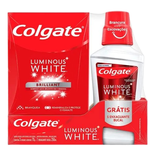 3 cremes dentais (70 g cada) da linha “Luminous White” + 1 enxaguante bucal — ideal para quem quer manter os dentes limpos, hálito fresco.