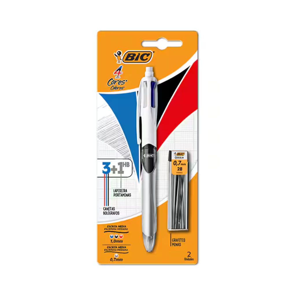 A famosa caneta esferográfica de 4 cores agora também inclui um lapiseira! com a caneta e lapiseira Bic 4 cores 3+1, você pode expressar seus pensamentos com preto, azul, vermelho e uma lapiseira de 0,7 mm. é perfeito para anotações e organização, com um design retrátil que permite alternar as cores com facilidade.