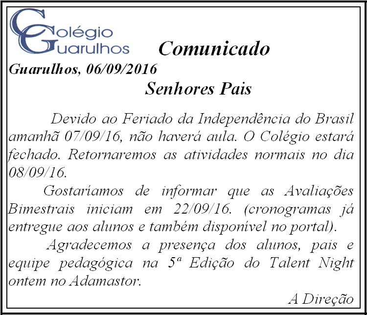 Talent Night O COLÉGIO GUARULHOS CONVIDA PARA A5ª Edição do Talent NightDESCOBRINDO TALENTOS!DIA: 05 de setembro de 2016Horário: 18h40minLocal: Teatro ADAMASTORAv. Monteiro Lobato Leia mais: Talent Night