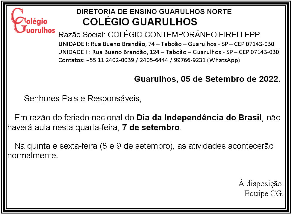 Leia mais: Feriado - 07/09/2022