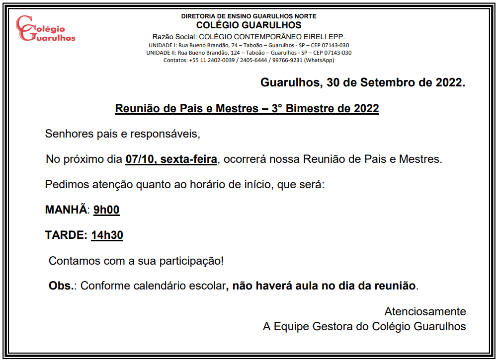 Leia mais: Reunião de Pais e Mestres - 3º Bimestre