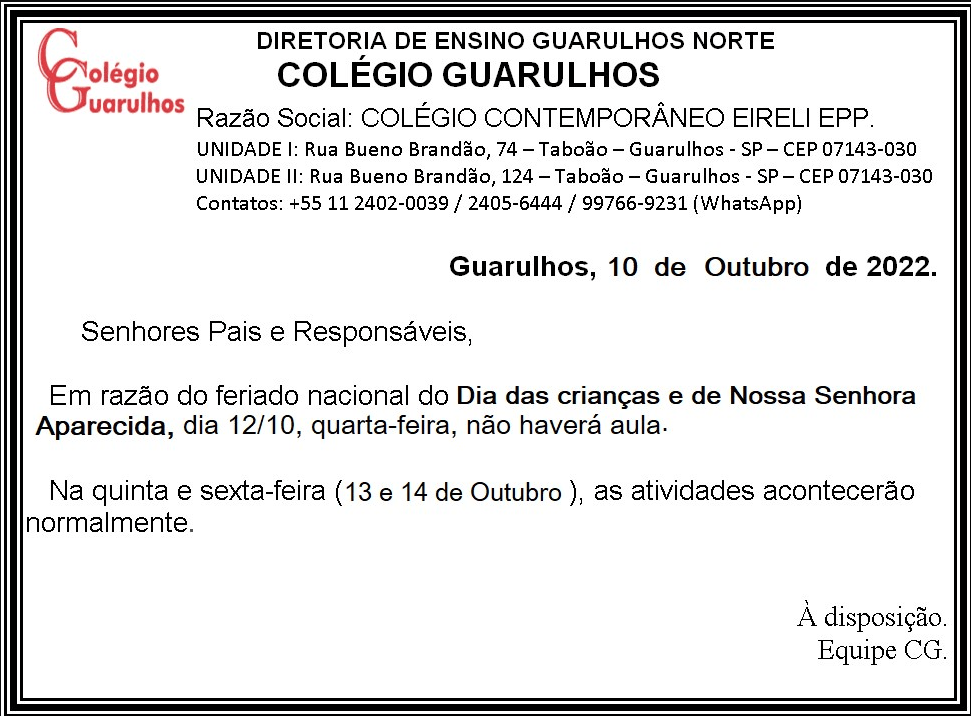 Leia mais: Feriado - 12/10/2022